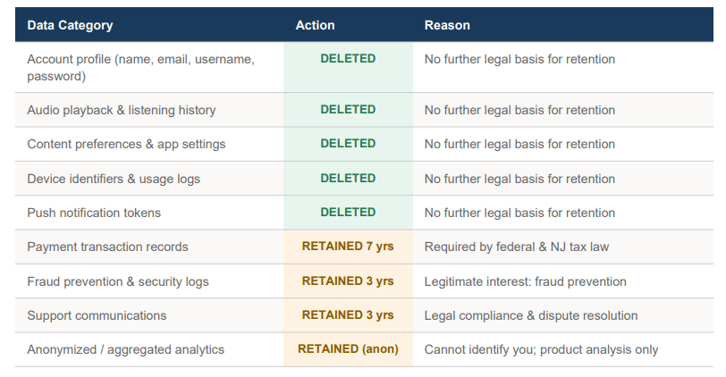 — Retained data: Certain data categories will be retained as required by applicable federal and NJ state law or for legitimate legal purposes including fraud prevention and dispute resolution. Such retention is legally required and does not violate your deletion rights.